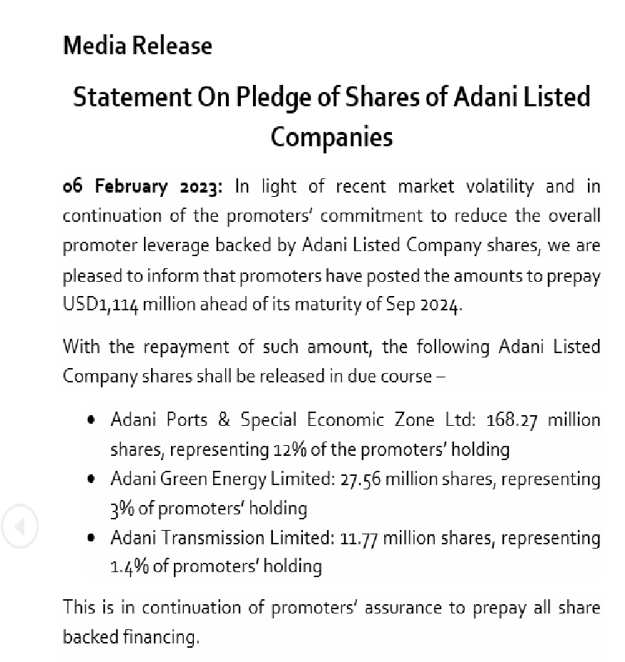 પ્રમોટરોએ 3 કંપનીના ગીરવે મૂકેલા શેર પ્રીપેમેન્ટ કરીને છોડાવી લીધા છે. આ સાથે પ્રમોટર્સ દ્વારા અદાણી પોર્ટ્સ-સેઝના ગીરવે મૂકેયાલે શેરહોલ્ડિંગનું પ્રમામ 17.31 ટકાથી ઘટીને 5.31 ટકા થયું છે, તો અદાણી ગ્રીન એનર્જીના પ્લેજ્ડ શેર્સની સંખ્યા 4.36 ટકાથી ઘટીને 1.36 ટકા અને અદાણી ટ્રાન્સમિશનના શેરની સંખ્યા 6.62 ટકાથી ઘટીને 5.22 ટકા થઈ છે.