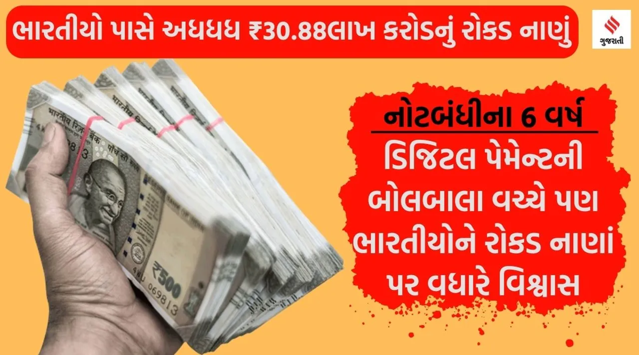 સરકારે 8 નવેમ્બર, 2016ના રોજ નોટબંધીની જાહેરાત કરી હતી. નોટબંધીના છ વર્ષ બાદ હાલ દેશમાં જેટલું રોકડ નાણું છે તેટલું અગાઉ ક્યારેય ન હતું. ભારતીયો પાસે હાથ ઉપર રહેલા રોકડ નાણાંનું પ્રમાણ ઐતિહાસિક ઉંચાઇએ પહોંચ્યુ છે. આ બાબત દર્શાવે છે કે રોકડ નાણાં દ્વારા ચૂકવણીની પદ્ધતિ હજુ પણ લોકો દ્વારા પસંદ કરવામાં આવી રહી છે. રિઝર્વ બેન્ક ઓફ ઈન્ડિયા (RBI)ના ડેટા અનુસાર, 21 ઓક્ટોબર, 2022ના રોજ દેશમાં ઉપલબ્ધ કુલ રોકડ 30.88 લાખ કરોડ રૂપિયા છે, જે 4 નવેમ્બર, 2016ના રોજની 17.97 લાખ કરોડ રૂપિયા કરતા લગભગ 80 ટકા વધારે છે.