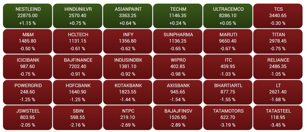 શેરબજારમાં બુધવારે વેચવાલીનું તીવ્ર દબાણ અનુભવાતા સેન્સેક્સના 30માંથી 28 બ્લુચીપ સ્ટોક ઘટીને બંધ થયા હતા. જેમાં ટાટા સ્ટીલ 3.5 ટકા, ટાટા મોટર્સ 3.2 ટકા, બજાજ ફિનસર્વ 2.9 ટકાના ઘટાડે ટોપ-3 લૂઝર્સ બન્યા હતા. વધનાર શેરમાં નેસ્લે, એયયુએલ અને એશિયન પેઇન્ટ્સ અડધાથી 1 ટકા જેટલા સુધર્યા હતા.