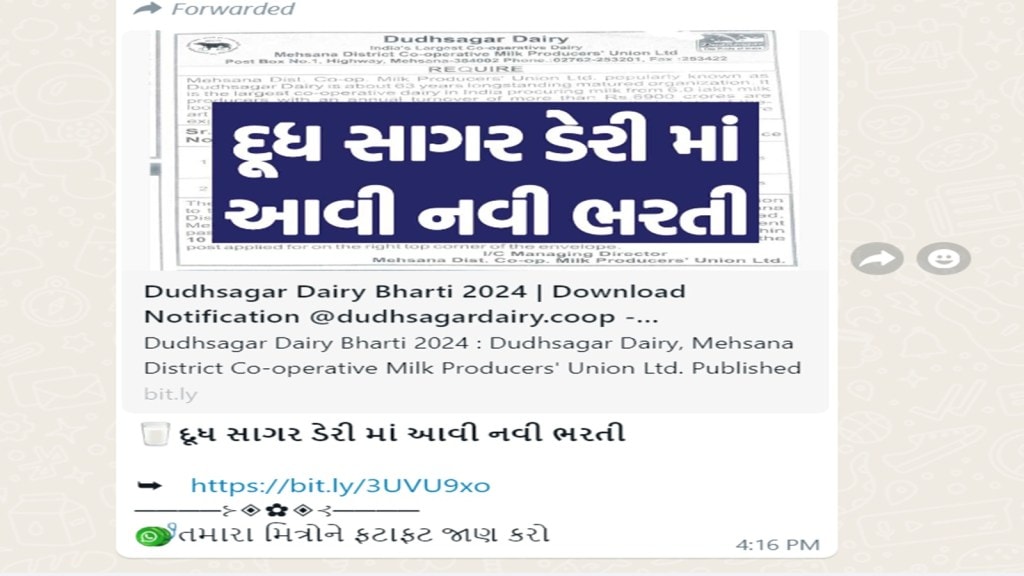 Recruitment Fact Check : અત્યારે સોશિયલ મીડિયા ઉપર મહેસાણા દૂધસાગર ડેરી ભરતીના સમાચાર વાયરલ થઈ રહ્યા છે ત્યારે આ સમાચારમાં દૂધસાગર ડેરી દ્વારા વિવિધ પોસ્ટ માટે ભરતીની જાહેરાત અંગે જણાવવામાં આવ્યું છે. જોકે, આ વાયરલ સમાચાર અંગે ઇન્ડિયન એક્સપ્રેસ દ્વારા ક્રોસ ચેક કરવામાં આવ્યું હતું. જેમાં જાણવા મળ્યું હતું કે આ સમાચાર ખોટા છે. મહેસાણા દૂધસાગર ડેરીના સૂત્રો પાસેથી મળતી માહિતી પ્રમાણે દૂધસાગર ડેરી દ્વારા આવી કોઈ ભરતી બહાર પાડવામાં આવી નથી.