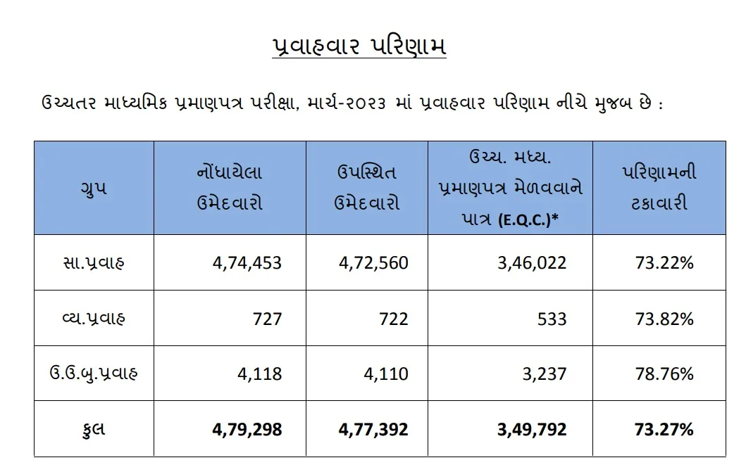 ઉચ્ચતર માધ્યમિક પ્રમાણપત્ર પરીક્ષા, માર્ચ 2023માં પ્રવાહવાર પરિણામ આ પ્રમાણે છે.
