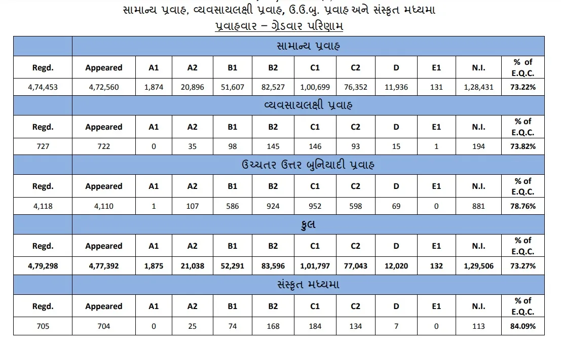 GSEB 12th Result Live : સામાન્ય પ્રવાહ, વ્યવસાયલક્ષી પ્રવાહ, ઉ.ઉ.બુ. પ્રવાહ અને સંસ્કૃત મધ્યમા પ્રવાહવાર - ગ્રેડવાર પરિણામ