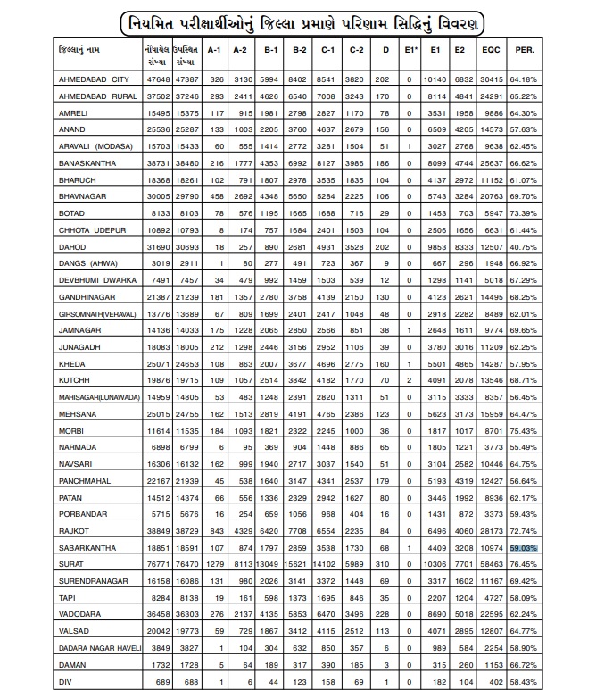GSEB SSC 10th Result 2023 : ગુજરાત માધ્યમિક અને ઉચ્ચત્તર માધ્યમિક શિક્ષણ બોર્ડ દ્વારા એસએસસી ધોરણ 10નું પરિણામ જાહેર કરવામાં આવ્યું છે. ગુજરાત રાજ્યમાં કુલ 64.62 ટકા પરિણામ નોંધાયું છે. તેમાં સૌથી વધુ પરિણામ ધરાવતો જિલ્લો સુરત નોંધાયો છે, જ્યારે સૌથી ઓછુ પરણામ ધરાવતો જિલ્લો દાહોદ નોંધાયો છે. ગત વર્ષે 2022માં પણ સૌથી વધુ પરિણામ ધરાવતા જિલ્લામાં સુરતે બાજી મારી હતી, જ્યારે સૌથી ઓછુ પરિણામ ધરાવતો જિલ્લો પાટણ નોંધાયો હતા. સૌથી વધુ પરિણામ ધરાવતા કેન્દ્રમાં બનાસકાંઠાના કુંભારીયા કેન્દ્રએ બાજી મારી છે, જ્યારે સૌથી ઓછુ પરિણામ ધરાવતા કેન્દ્રમાં નર્મદા જિલ્લાનું ઉતાવળી કેન્દ્ર નોંધાયું હતું.