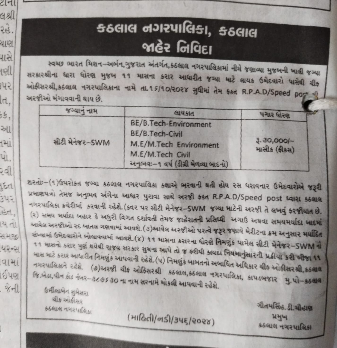 કઠલાલ નગરપાલિકા ભરતી, સીટી મેનેજ - photo- facebook