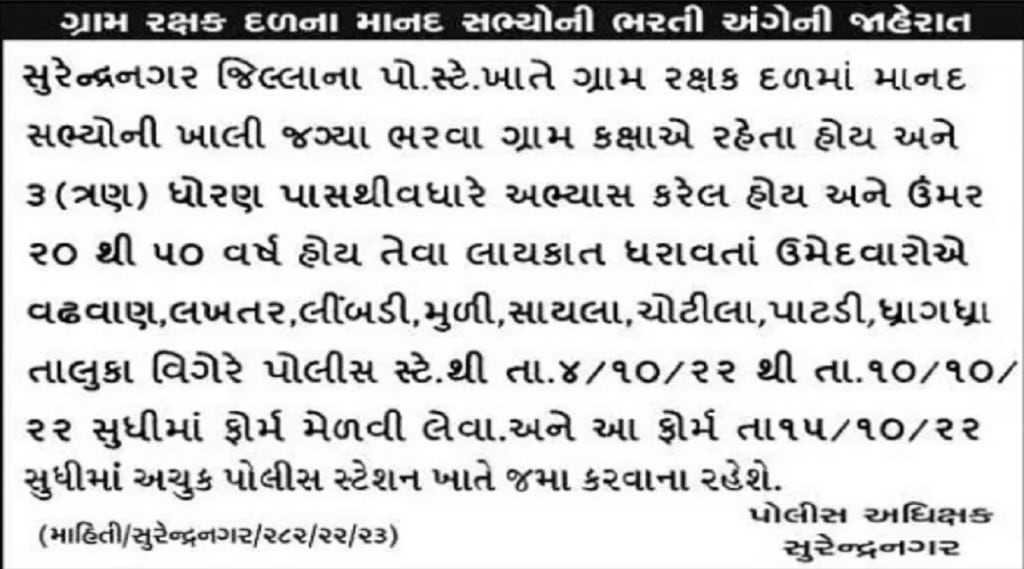 ઓછું ભણેલા ઉમેદવારો નોકરીની શોધમાં છો તો તમારા માટે નોકરીની સારો મોકો આવી ગયો છે. સુરેન્દ્રનગર જિલ્લાના વિવિધ પોલીસ સ્ટેશનોમાં ગ્રામ રક્ષક દળની ભરતીની જાહેરાત બહાર પડી છે. રસ ધરાવતા ઉમેદવારો જિલ્લાના વિવિધ તાલુકા પોલીસ સ્ટેશનેથી ફોર્મ મેળવી અને જમા કરવાના રહેશે. શૈક્ષણિક લાયકાત, વય માપદંડ, પસંદગી પદ્ધતિ, મહત્વપૂર્ણ તારીખ અને અન્ય પાત્રતા પ્રક્રિયા વિશે વિગેતે વાંચો