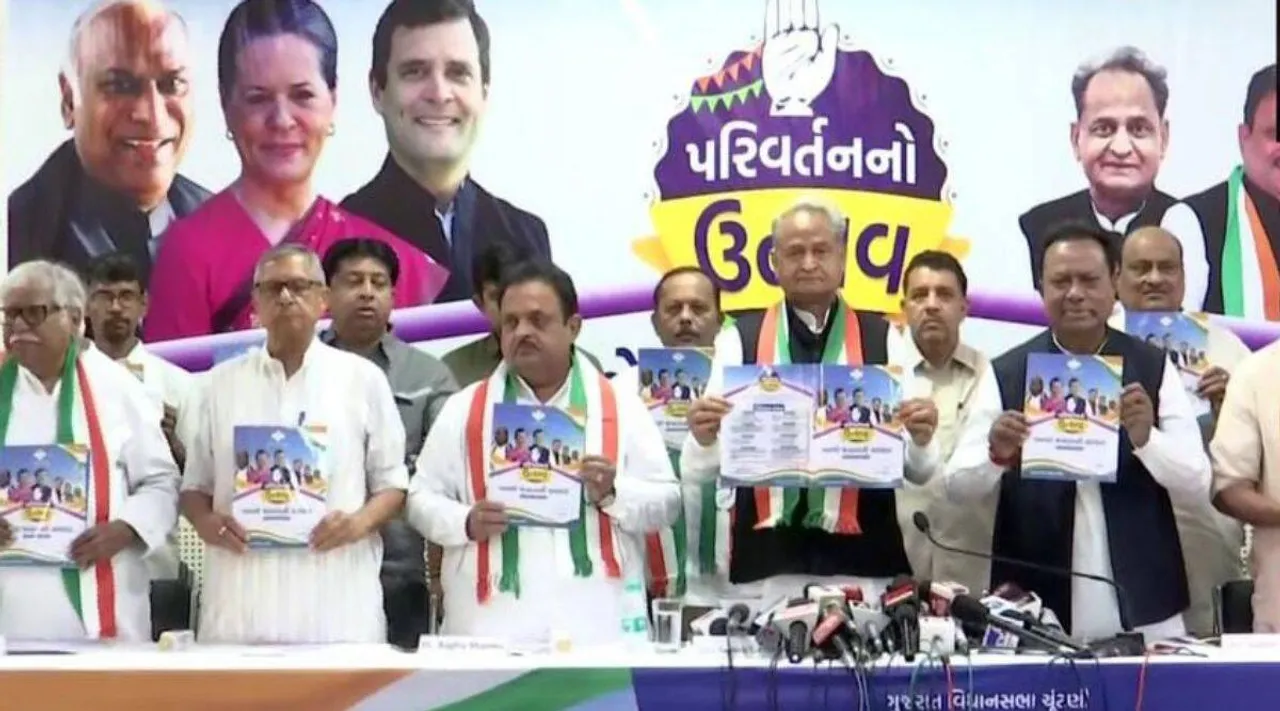Gujarat Elections: ગુજરાત વિધાનસભાની ચૂંટણી જાહેર થાય બાદ ઉમેદવારોના નામ પણ જાહેર થવા લાગ્યા છે. ત્યારે ગુજરાત કોંગ્રેસે વિધાનસભા ચૂંટણી માટે ચૂંટણી ઢંઢેરો જાહેર કર્યો છે. કોંગ્રેસ સરકાર બનવા પર મફત વીજળી અને ખેડૂોના દેવાની માફીનો વાયદો કર્યો છે. અમદાવાદમાં રાજસ્થાનના મુખ્યમંત્રી અને કોંગ્રેસા વરિષ્ઠ નેતા અશોક ગહેલોતે ઘોષણાપત્ર રજૂ કર્યું હતું અને આ દરમિયાન અનેક નેતાઓ હાજર રહ્યા હતા.
