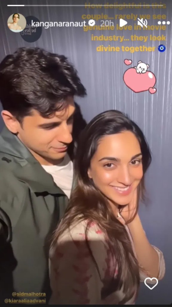 કંગના રનૌતે સોશિયલ મીડિયા પર સિદ્ધાર્થ-કિયારાના લગ્ન અંગે પોતાનો અભિપ્રાય વ્યક્ત કર્યો છે. અભિનેત્રીએ ઇન્સ્ટાગ્રામ પર ખૂબ જ ક્યૂટ પોસ્ટ શેર કરી છે જેમાં તેણે સિદ્ધાર્થ-કિયારા વિશે હૃદય સ્પર્શી વીડિયો શેર કર્યો છે. કંગના રનૌતે કિયારા અડવાણી-સિદ્ધાર્થ મલ્હોત્રાની ફિલ્મ શેર શાહના ગીત ‘તેરી મેરી ગલ્લા હોગી મશહૂર’નો ફોટો અને વીડિયો શેર કર્યો છે. બંનેના વખાણ કરતાં અભિનેત્રીએ તેમને બોલિવૂડનું સૌથી ક્યૂટ કપલ ગણાવ્યું છે. કંગનાની આ ઈન્સ્ટા સ્ટોરી વાયરલ થઈ રહી છે.