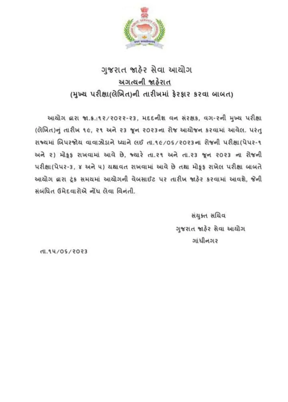 ગુજરાત જાહેર સેવા આયોગ - GPSC દ્વારા જાહેરાત ક્રમાંક 12/2022-23, મદદનીશ વન સંરક્ષક, વર્ગ-2ની પરીક્ષા લેખિત પરીક્ષા 19,21 અને 23 જૂન 2023ના રોજ યોજવાનું આયોજન કરવામાં આવ્યું હતું. પરંતુ રાજ્યમાં બિપરજોય વાવાઝોડાને ધ્યાને લઈ 19 જૂન-2023ના રોજ યોજાનાર પરીક્ષા પેપર-1 અને 2 મોકૂફ રાખવામાં આવી છે. જ્યારે 21 અને 23 જૂન 2023ના રોજની પરીક્ષા પેપર-3, 4 અને 5 યથાવત રાખવામાં આવી છે. મોકૂફ રાખવામાં આવેલી પરીક્ષા બાબતે આયોગ દ્વારા ટૂંક સમયમાં આયોગની વેબસાઈટ પર તારીખ જાહેર કરવામાં આવશે. જેની સંબંધિત ઉમેદવારોએ નોંધ લેવા સંયુક્ત સચિવ, ગુજરાત જાહેર સેવા આયોગ, ગાંધીનગરની યાદીમાં જણાવાયું છે.