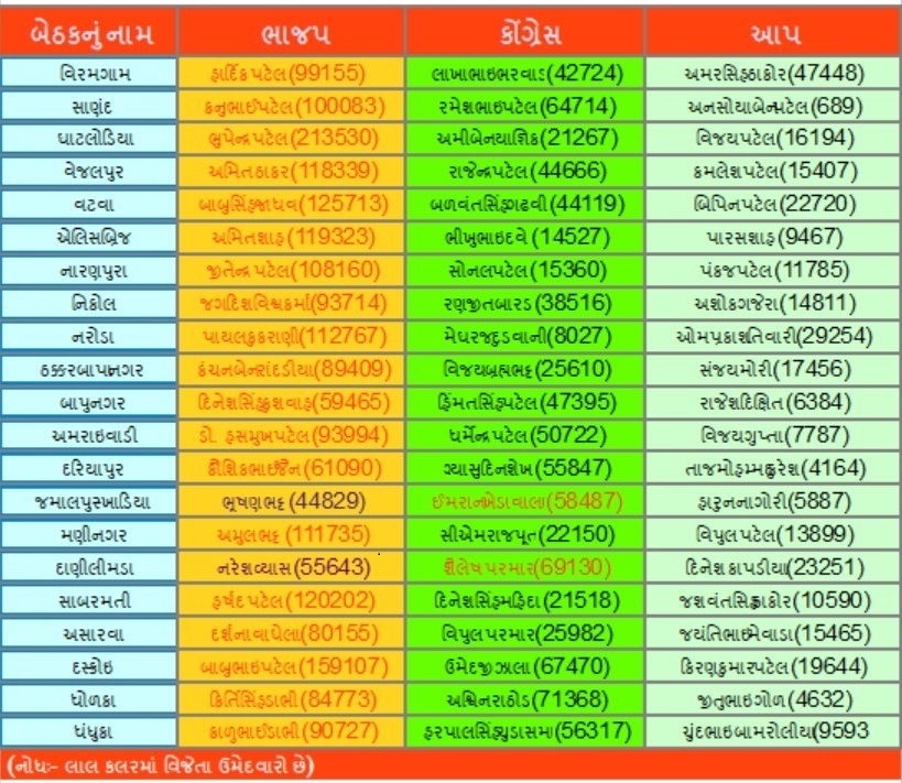 પાટીદાર અનામત આંદોલનના નેતા અને એક સમયે નરેન્દ્ર મોદી તેમજ ભાજપના કટ્ટર વિરોધી હાર્દિક પટેલે ભાજપમાં જોડાઇ ગયા બાદ વિરમગામ બેઠક પરથી પહેલીવાર વિધાનસભાની ચૂંટણી લડી છે. હાર્દિક પટેલે 99155 મત મેળવી જીત મેળવી છે. તો કોંગ્રેસના ઉમેદવાર લાખાભાઇ ભરવાડને 42724 અને અમરસિહ ઠાકોરને 47448 મત મળતા કારમી હારી થઇ છે. નિકોલના સિટિંગ ધારાસભ્ય અને મંત્રીમંડળના નેતા જગદીશ વિશ્વકર્મા 93714 મત સાથે વિજય થયા છે.
