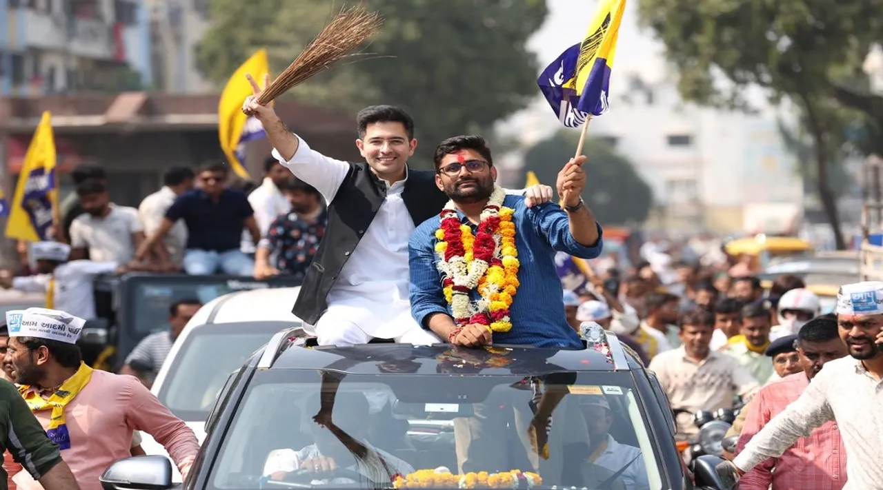 આપના ગુજરાત પ્રદેશ સહ-પ્રભારી રાઘવ ચઢ્ઢા અને ગોપાલ ઈટાલિયાની ઉપસ્થિતિમાં વિજય સંકલ્પ રેલી યોજાઈ હતી (તસવીર - આપ ગુજરાત ટ્વિટર)