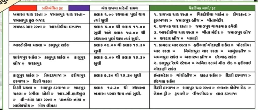 Rathyatra 2023 in Ahmedabad : અમદાવાદમાં અષાઢી બીજ મંગળવારના દિવસે ભગવાન જગન્નાથની રથયાત્રા નીકળશે ત્યારે 18 કિલોમીટરના રૂટમાં રણછોડરાયનો રથ ફરીને નીજ મંદિર પરત ફરશે. આ દિવસે રથયાત્રાના રૂટ વ્યવસ્થાના ભાગરૂપ કેટલાક રસ્તાઓ બંધ કરવામાં આવશે. જ્યારે કેટલાક રસ્તાઓ માટે ડાઇવર્ઝન પણ આવામાં આવશે.