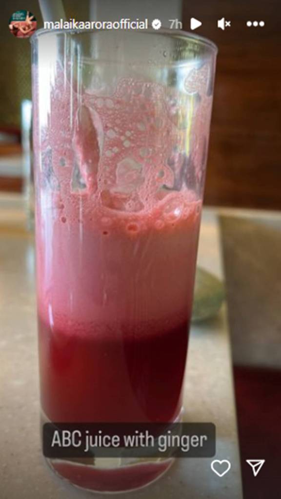 એક ડિટોક્સ ડ્રિન્ક જે તેના પૌષ્ટિક ગુણધર્મો માટે ઘણા લોકોમાં પ્રિય બની ગયું છે તે એબીસી જ્યુસ છે, જે એપલ, બીટરૂટ અને ગાજરનું ટૂંકું નામ છે. ઘણા લોકો સફરજનની જગ્યાએ આમળાનો પણ ઉપયોગ કરે છે. અહીં તમે એબીસી જ્યુસની એક ઝલક જોશો જે અભિનેત્રી મલાઈકા અરોરાએ આદુના ચુર્ણ સાથે માણ્યો હતો.