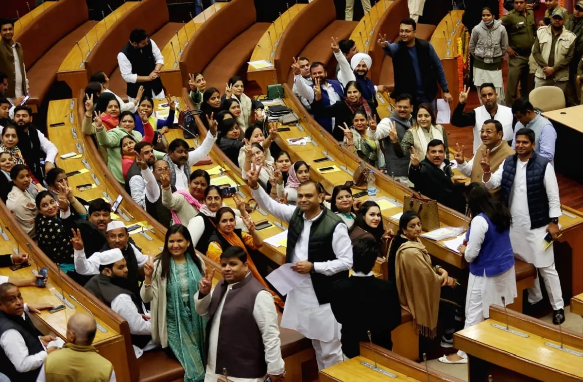 AAP મેયરના ઉમેદવાર શેલી સોમવારે નવી દિલ્હીમાં સિવિક સેન્ટર ખાતે મેયરની ચૂંટણી માટે મતદાન કરતા પહેલા ગૃહમાં નવા ચૂંટાયેલા કાઉન્સિલરો સાથે વિજય દર્શાવે છે. EXPRESS PHOTO BY PRAVEEN KHANNA 06 02 2023.