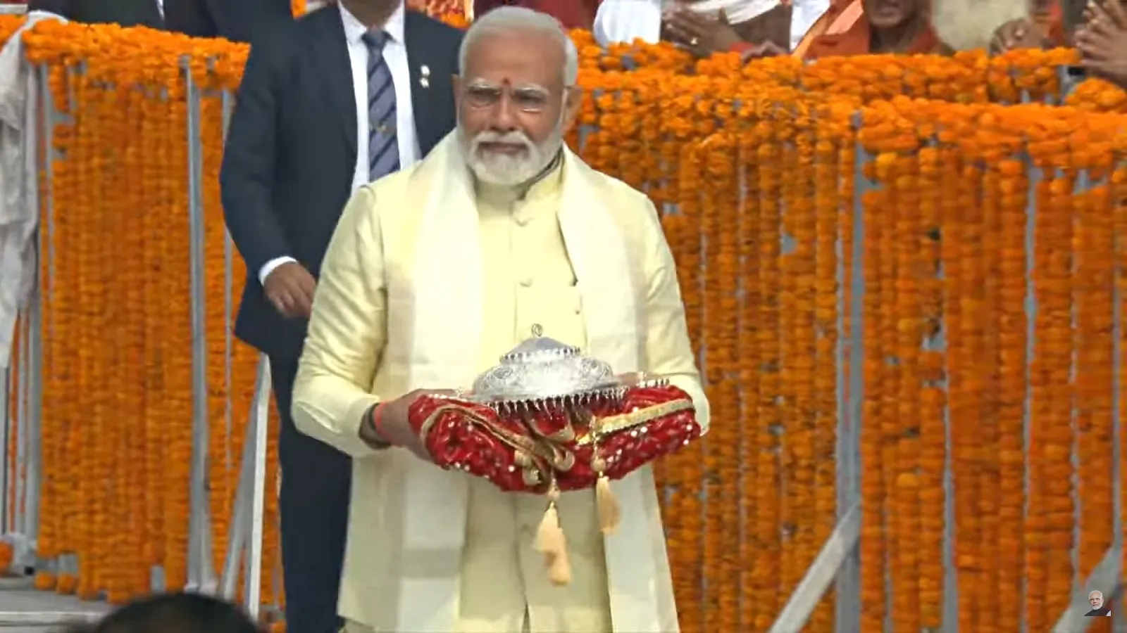 વડાપ્રધાન નરેન્દ્ર મોદીએ અયોધ્યા રામ મંદિર પ્રાણ પ્રતિષ્ઠા માટે હાથમાં ચાંદીનું છત્ર લઇને મંદિરમાં પ્રવેશ કર્યો હતો. શંખની મંગળ ધ્વનીનાદના ભક્તિમય માહોલમાં પીએમ મોદીએ મુરલી દ્વારથી રામ મંદિરમાં પ્રવેશ કર્યો હતો.
