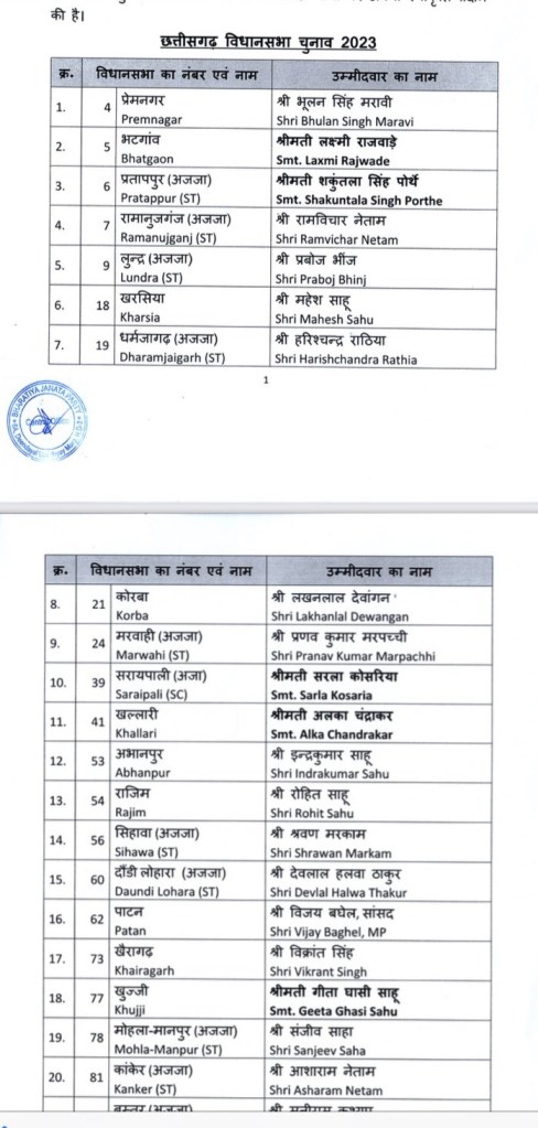 છત્તીસગઢ વિધાસભાની 21 બેઠકો માટે ઉમેદવારોની જાહેરાત (BJP Candidates List for Chhattisgarh Assembly Election 2023)