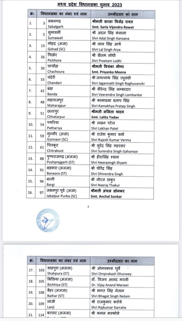 મધ્યપ્રદેશ વિધાનસભાની 39 બેઠકો માટે ઉમેદવારો જાહેર (BJP Candidates List for Madhya Pradesh Assembly Election 2023)