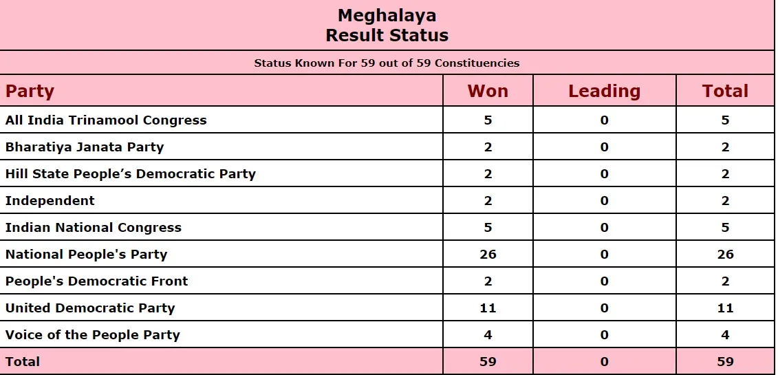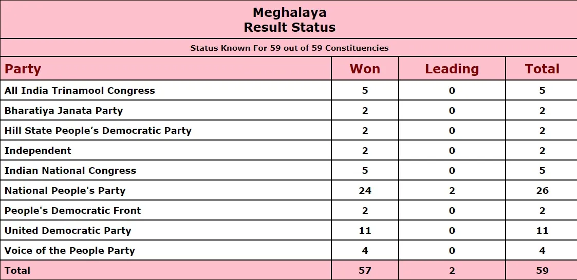મેઘાલય વિધાનસભા ચૂંટણીમાં નેશનલ પીપલ્સ પાર્ટી (એનપીપી) સૌથી મોટો પક્ષ બનીને સામે આવ્યો છે. એનપીપીએ 26 સીટો પર જીત મેળવી છે. સરકાર બનાવવા માટે 31 સીટોની જરૂર છે. યૂનાઇટેડ ડેમોક્રેટિવ પાર્ટી 11 સીટો જીતી બીજા ક્રમે રહી છે. તૃણમુલ કોંગ્રેસ અને કોંગ્રેસે 5-5 સીટ પર જીત મેળવી છે. બીજેપીને 2 જ બેઠકો મળી છે. આ સિવાય વોઇસ ઓફ ફ પીપલ્સ પાર્ટીએ 4, પીપલ્સ ડેમોક્રેટિવ ફ્રન્ટે 2, એચએસપીડીપીને 2 અને અપક્ષોએ 2 બેઠકો પર જીત મેળવી છે.