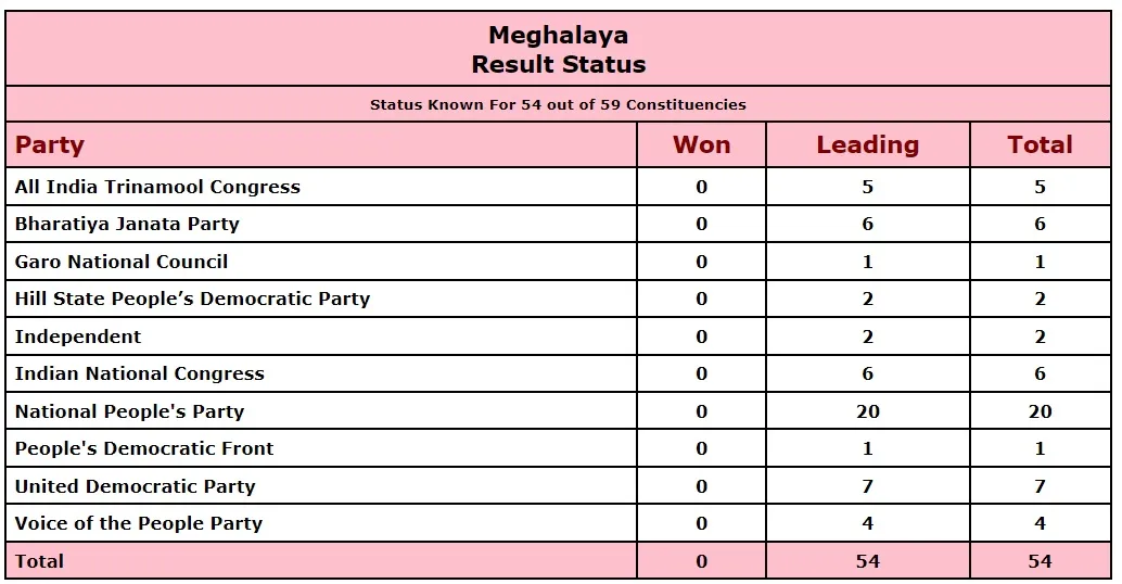 NPP મેઘાલયમાં સૌથી મોટી પાર્ટી બનવા માટે તૈયાર છે NPP 20 બેઠકો પર આગળ છે. જ્યારે ભાજપ 6 બેઠકો પર આગળ છે. જ્યારે અન્ય 27 બેઠકો પર આગળ ચાલી રહ્યા છે. જ્યારે કોંગ્રેસ માત્ર પાંચ સીટો પર આગળ ચાલી રહી છે. અન્યમાં ટીએમસીનો સમાવેશ થાય છે, જે 12 બેઠકો પર આગળ છે.