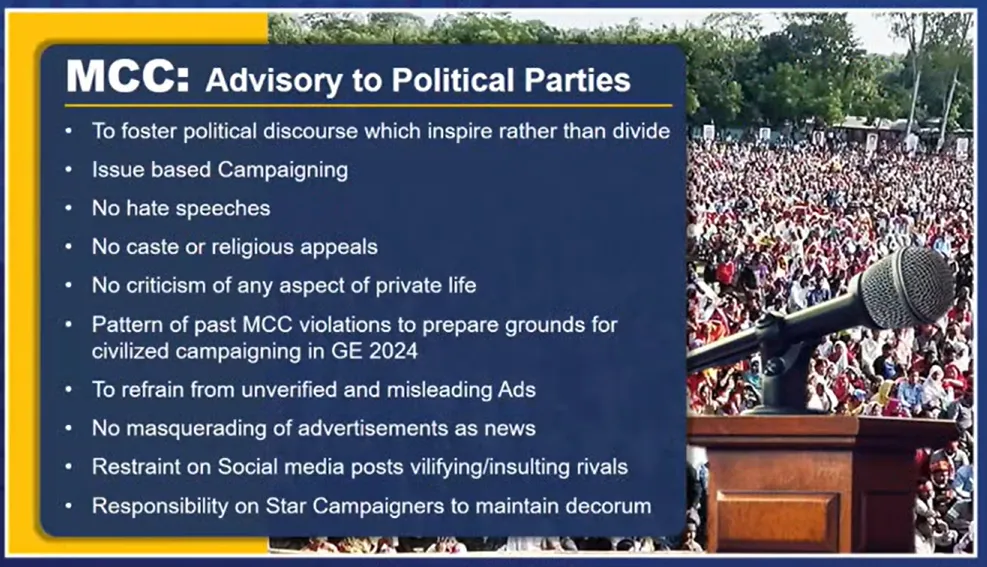 ચૂંટણી પંચ દ્વારા શનિવારે 16 માર્ચના રોજ લોકસભા ચૂંટણીની તારીખો જાહેર કરવામાં આવશે. ચૂંટણીની જાહેરાત સાથે જ દેશભરમાં આચાર સંહિતા લાગુ થઇ જશે. આચાર સંહિતામાં કઈ કઈ બાબતોનું ધ્યાન રાખવાનું રહેશે અહીં ક્લિક કરીને વાંચો સંપૂર્ણ માહિતી