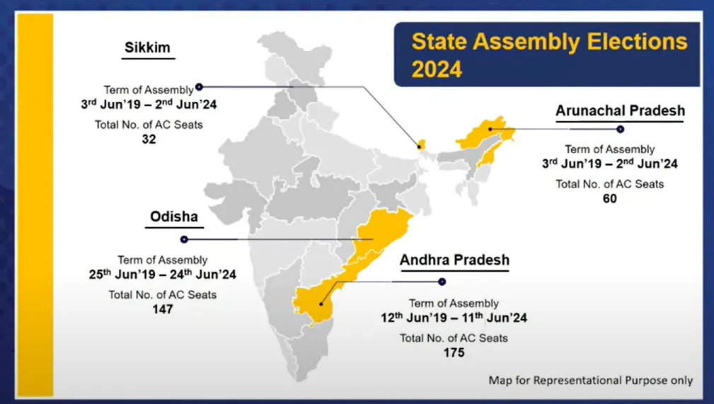 લોકસભા ચૂંટણીની સાથે ચૂંટણી પંચ કેટલાક રાજ્યોમાં વિધાનસભા ચૂંટણીના કાર્યક્રમની પણ જાહેરાત કરી શકે છે. આંધ્ર પ્રદેશ, સિક્કિમ, અરુણાચલ પ્રદેશ અને ઓડિશામાં વિધાનસભાઓનો કાર્યકાળ જૂનમાં અલગ-અલગ તારીખે પૂરો થઈ રહ્યો છે. આવી સ્થિતિમાં આ રાજ્યોમાં ચૂંટણીની તારીખો પણ જાહેર થઈ શકે છે. ચૂંટણી પંચની પ્રેસ કોન્ફરન્સને લગતી તમામ માહિતી માટે અહીં વાંચતા રહો.