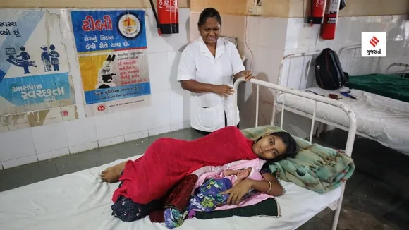 ચક્રવાત બિપરજોયના વિનાશચક્ર વચ્ચે નલિયાના સામુદાયિક આરોગ્ય કેન્દ્રમાં રશીદાબેન જાવેદ હાશિમ (23 વર્ષ) નામની મહિલાએ ગુરુવારની રાત્રે બાળકને જન્મ આપ્યો હતો. (Express photo by Nirmal Harindran)