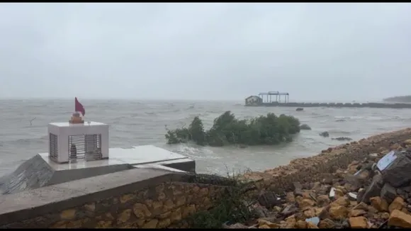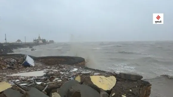 કોટેશ્વર પાસે ક્રીક વિસ્તારનો દરિયો તોફાની ચડ્યો, ઉંચા મોજા ઉછળતા દરિયાના પાણી ક્રીક વિસ્તારમાં ફરી વળ્યા છે. (Express photo)