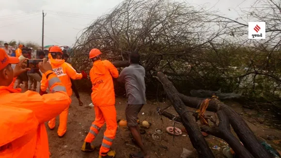 NDRFની ટીમ શુક્રવારે દેવભૂમિ દ્વારકા ખાતે રૂકમણી મંદિરના રસ્તા નજીક રૂપેણ બંદર ગામ નજીક વાવાઝોડાથી તૂટી ગયેલા વૃક્ષને કાપી રહી છે. (એક્સપ્રેસ ફોટો- ભુપેન્દ્ર રાણા)
