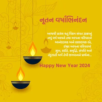 દિવાળી પછીના દિવસે ગુજરાતમાં નવું વર્ષ ઉજવાય છે. દિવાળી બાદ કારતક સુદ એકમ તિથિ પર નવા વિક્રમ સંવતની શરૂઆત સાથે ગુજરાતીઓ નવા વર્ષની ઉજવણી કરે છે. વિક્રમ સંવત 2081 સાથે નવું વર્ષ નવી આશા, ઉંમગ અને ઉત્સાહ શરૂ થઇ રહ્યું છે. નવા વર્ષની ઉજવણી ધામધૂમ કરવામાં આવે છે. અહીં તમારા પરિવાજનના સભ્યો, મિત્રો અને પ્રિયજનને નવા વર્ષના શુભેચ્છા સંદેશ મોકલી નૂતન વર્ષાભિનંદન પાઠવી શકો છો. (Photo: Canva