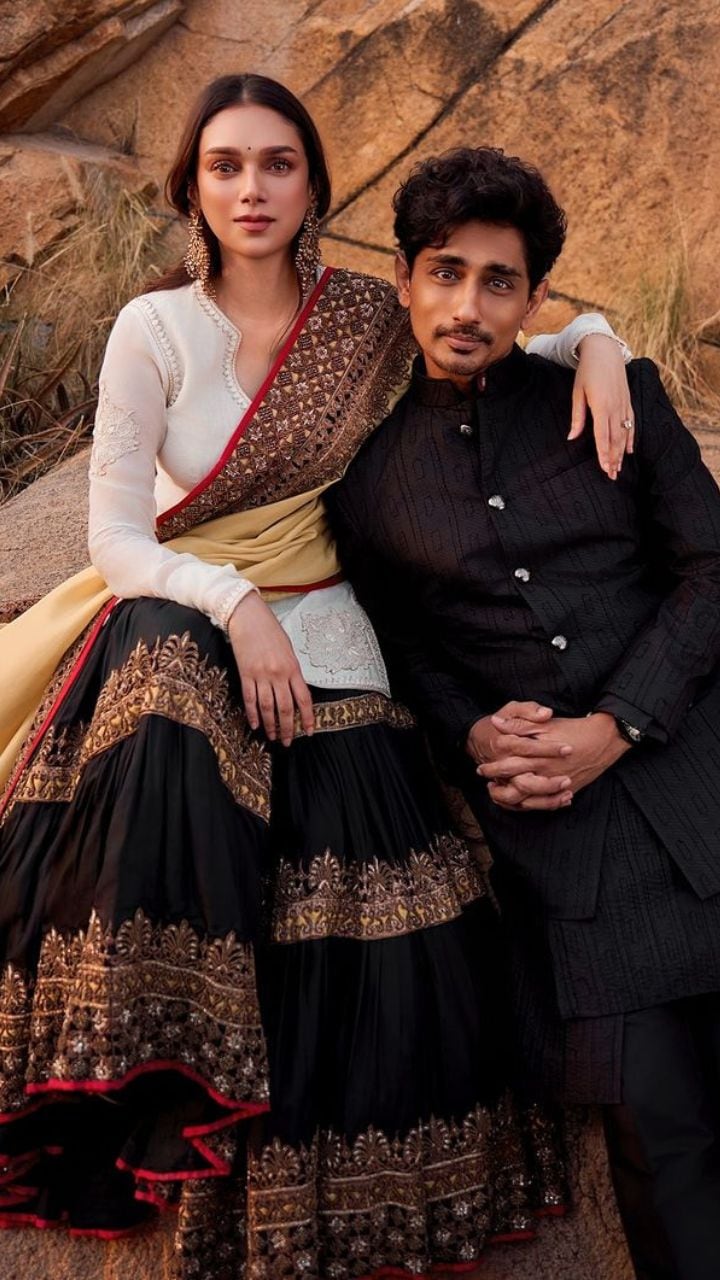 આ ફોટોમાં અદિતિ રાવ હૈદરીએ સફેદ અને બ્લેક કલરનો લહેંગા પસંદ કર્યો છે, જયારે સિદ્ધાર્થે બ્લેક સૂટ પસંદ કર્યું છે.