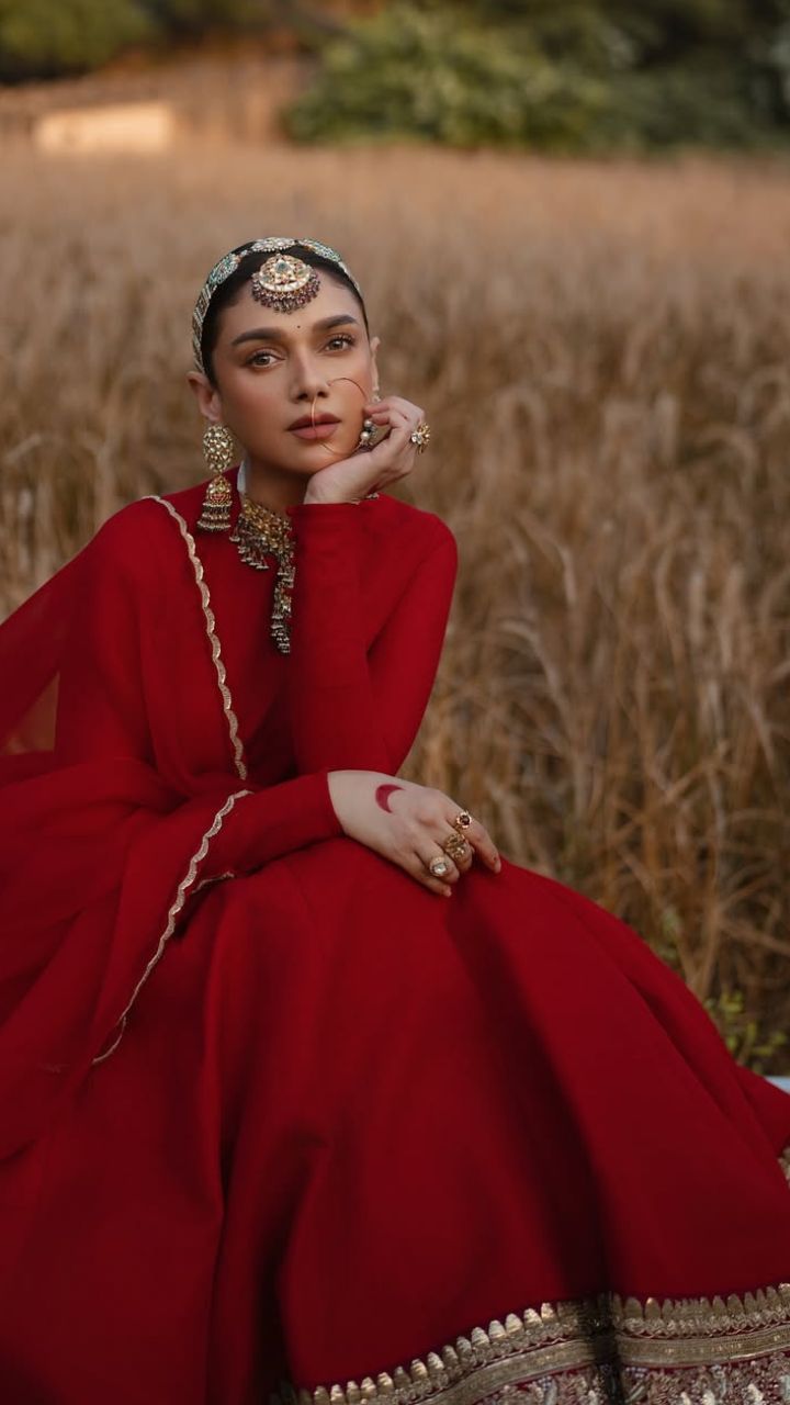 અદિતિ રાવ હૈદરીએ મેરેજ માટે સિમ્પલ રેડ ડ્રેસ સાથે હેવી કુંદન જ્વેલરી પહેરી હતી.