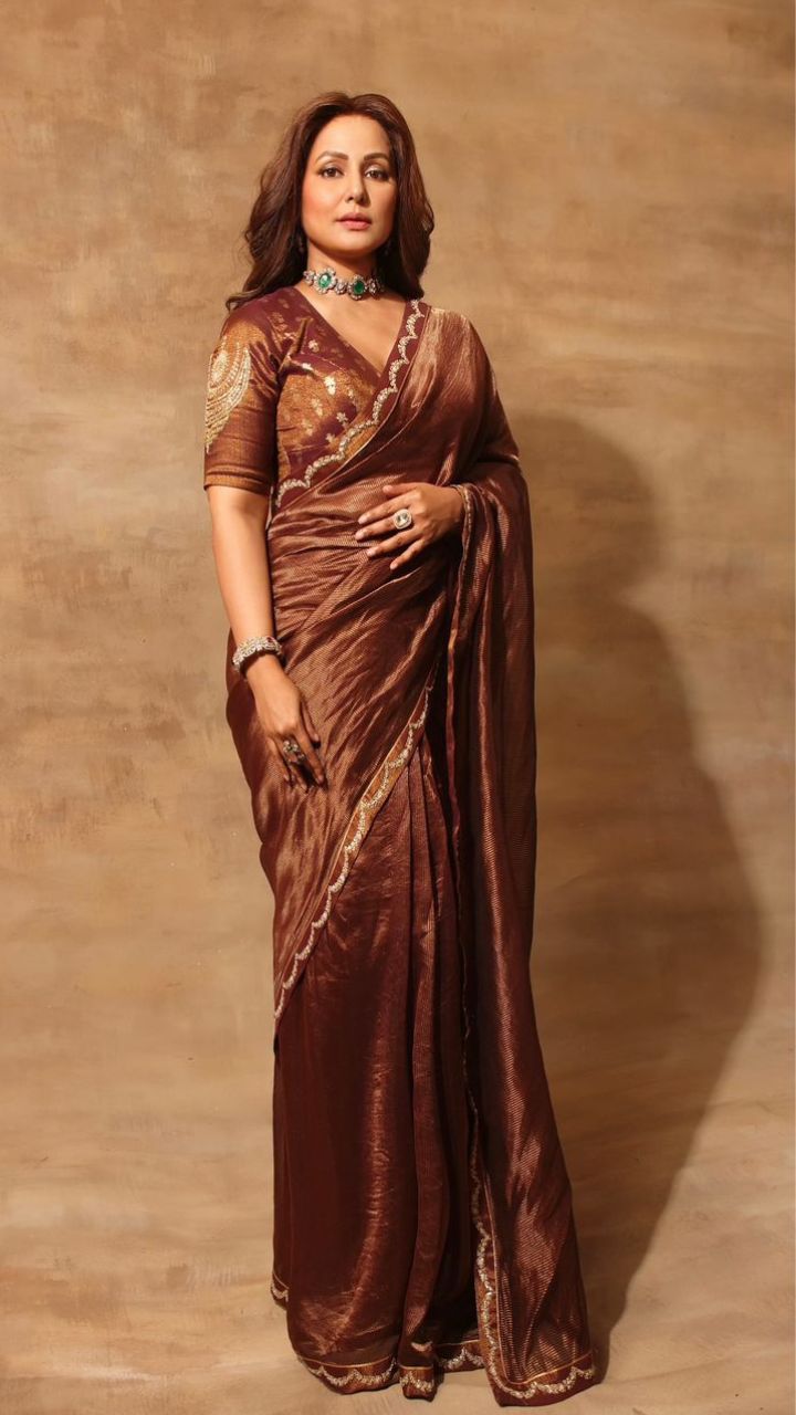 એકટ્રેસે કોફી સાઈન વાળી ગોલ્ડન બોર્ડરમાં સાડી પહેરી છે, જે ટોટલી પ્લેઇન છે, અને વી શેપ્ડ બ્લાઉઝમાં ગોલ્ડન ડિઝાઇન જોવા મળે છે.