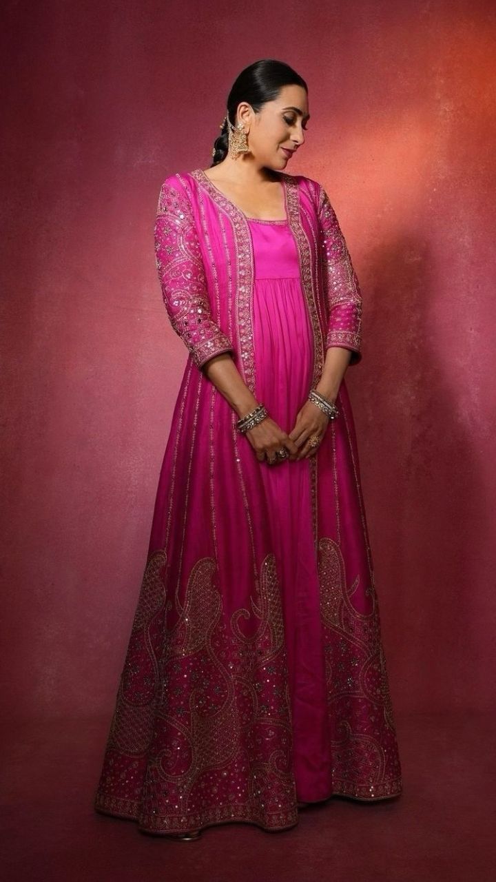 કરિશ્માએ ફ્લોર લેન્ગ ચમકદાર કોટી વાળું પિન્ક એથનિક વેર પસંદ કર્યું છે, એમાં કોટી ડિઝાઇન વાળી જોવા મળે છે અને ઇનર સિમ્પલ પિન્ક કલરમાં છે. આ લુક દિવાળી માટે પરફેક્ટ છે.