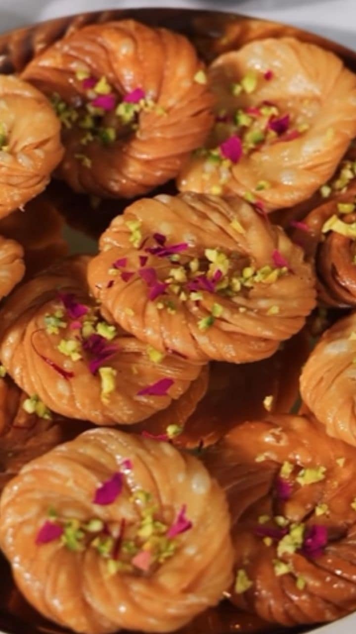 હવે તૈયાર મઠરીને ઠંડી થવા દો, અને થોડીવાર બાદ તેને ખાંડની ચાસણીમાં બોળીને પિસ્તા અને ગુલાબની પાંખડીઓથી સજાવો અને સર્વ કરો.