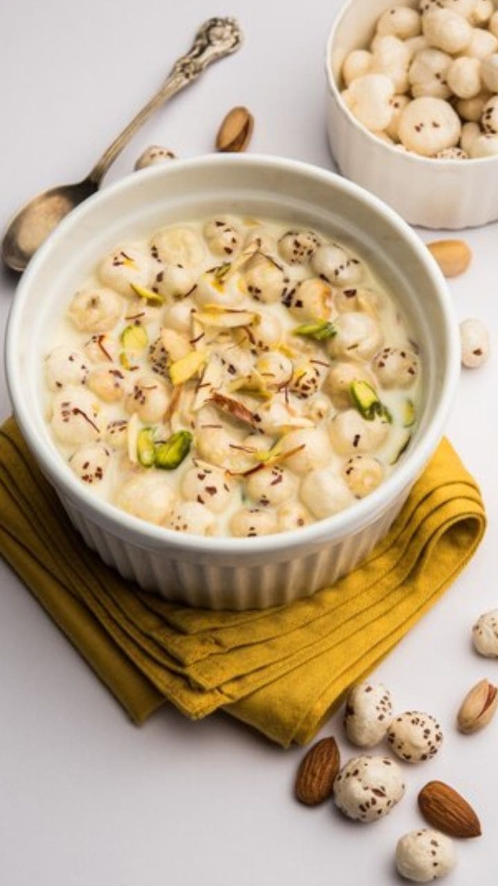 1 કપ મખાના, 1 લિટર દૂધ, 1/4 કપ ખાંડ (સ્વાદ મુજબ), 2-3 લીલી એલચી પાવડર, 1 કપ બદામ, 1/4 કપ પિસ્તા, 10 કેસર, ચમચી ઘી