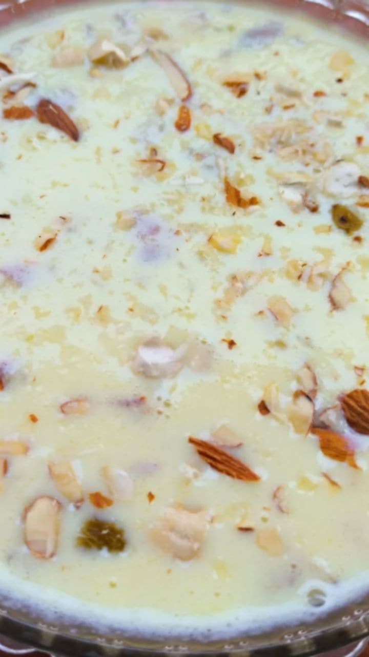ગેસને બંધ કરો અને ખીરને એક પીરસવાના બાઉલમાં કાઢો. તેને કાપેલી બદામથી સજાવો અને ગરમ અથવા ઠંડી પીરસો.