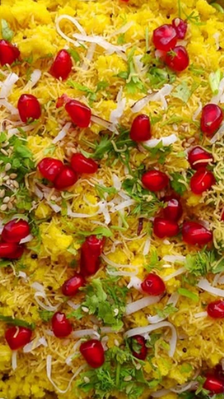 હવે એક સર્વિંગ પ્લેટ માં ખમણનો વઘારેલો ભૂકો લો. તેના ઉપર સેવ, દાડમ, કાજુ અને કોથમીર નાખી ચટણી સાથે સર્વ કરો.