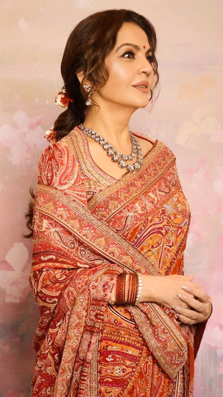 શિવ મંદિરની સ્થાપના માટે નીતા અંબાણીએ તરુણ તાહીલિયાની દ્વારા ડિઝાઈન કરેલ ખુબ જ સુંદર લાલ રંગમાં પ્રિન્ટેડ જામેવાર સાડી પહેરી હતી.
