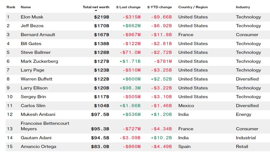 દુનિયાના ધનિકોની યાદીમાં અમેરિકાનો દબદબો રહ્યો છે. ટોપ-10 બિલિયોનર્સમાં 9 અમેરિકન ધનાઢ્યો છે. દુનિયાના સૌથી ધનિક વ્યક્તિ છે ટેસ્લા કંપની અને ટ્વિટરના માલિક એલોન મસ્ક, તેમની પાસે 219 અબજ ડોલર સંપત્તિ છે. તો એમેઝોનના સીઇઓ જેફ બેઝોસ 170 અબજ ડોલરની સંપત્તિ સાથે બીજા ક્રમે અને ફ્રાન્સના ઉદ્યોગપતિ બર્નાર્ડ આર્નોલ્ટ 167 અબજડોલરની સંપત્તિ સાથે દુનિયાના ત્રીજા સૌથી ધનિક વ્યક્તિ છે.